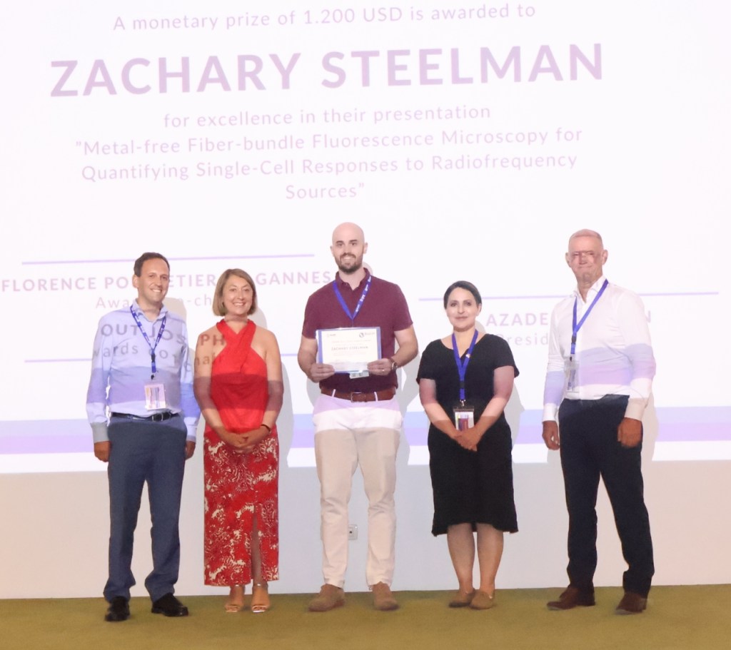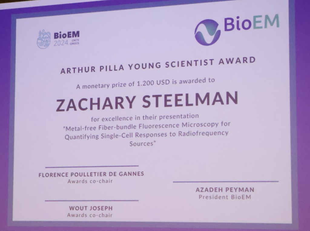 The Annual Bioelectromagnetics (BioEM) meeting took place in Chania on the beautiful island of Crete in Greece this year, and with it our 7th Annual Arthur Pilla Young Scientist Award was awarded! Dr. Zachary Steelman from the U.S. Air Force Research Laboratory in Fort Sam Houston, San Antonio, TX was awarded the esteemed prize with his presentation entitled, “Metal-Free Fiber-Bundle Fluorescence Microscopy for Quantifying Single-Cell Responses to Radio-Frequency Sources”. The study sought to develop a microscopy system compatible with high-power radiofrequency radiation, in order to better study single-cell responses to electromagnetic stimulation.